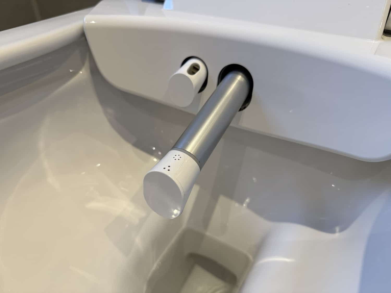Über die App kann man den Duschkopf und den Föhn herausfahren, um diese manuell reinigen zu können. Das ist auch notwendig, vor allem beim Duschkopf. Wenn man das Klo putzt, sollte man auch die manuelle Reinigung der Düsen und des ausfahrbaren Arms in Angriff nehmen.