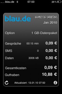 Die Daten bezieht die App direkt von den Webseiten der Provider – daher muss man vorher seinen Login angeben. Wer jedoch nur einen schnellen Blick auf seinen Verbrauch werfen und dafür nicht extra den Safari anschmeißen will, sollte mit Kosten ein gutes Geschäft machen. Derzeit ist die Applikation in der Version 1.3 für 79 Cent erhältlich.