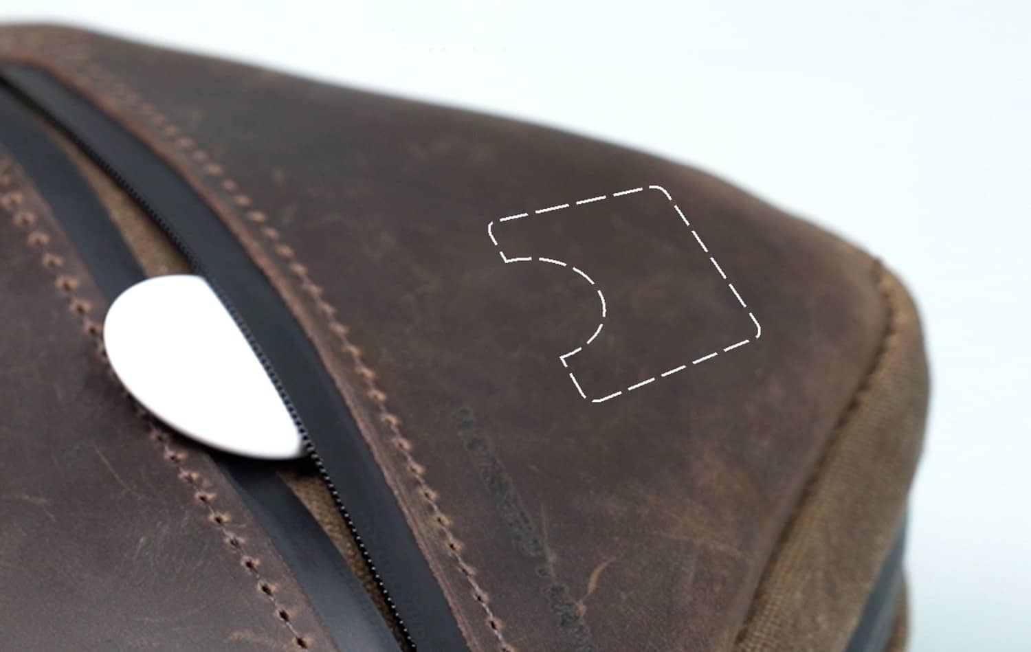 - Eine gepolsterte Reißverschlusstasche auf der Vorderseite bietet Platz für kleine Kabel, SD-Karten oder andere kleine Gegenstände, und enthält einen eingenähten AirTag-Einschub.