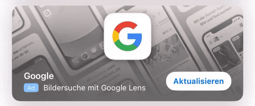 Apple wollte sicherstellen, dass Kunden und Kundinnen die Werbung ohne zutun komplett einsehen können. Der Werbebanner wird weiterhin an zweiter Stelle angezeigt. Ganz zufrieden war man mit der Darstellung wohl nicht, denn seit ein paar Wochen hat Apple erneut Hand angelegt und die Werbung wieder bearbeitet. Die Anzeigenposition ist etwas größer geworden und ist jetzt sogar animiert. Das App-Icon wird in der Mitte angezeigt, während im Hintergrund die App Store-Screenshots der jeweiligen App animiert über den Banner laufen.