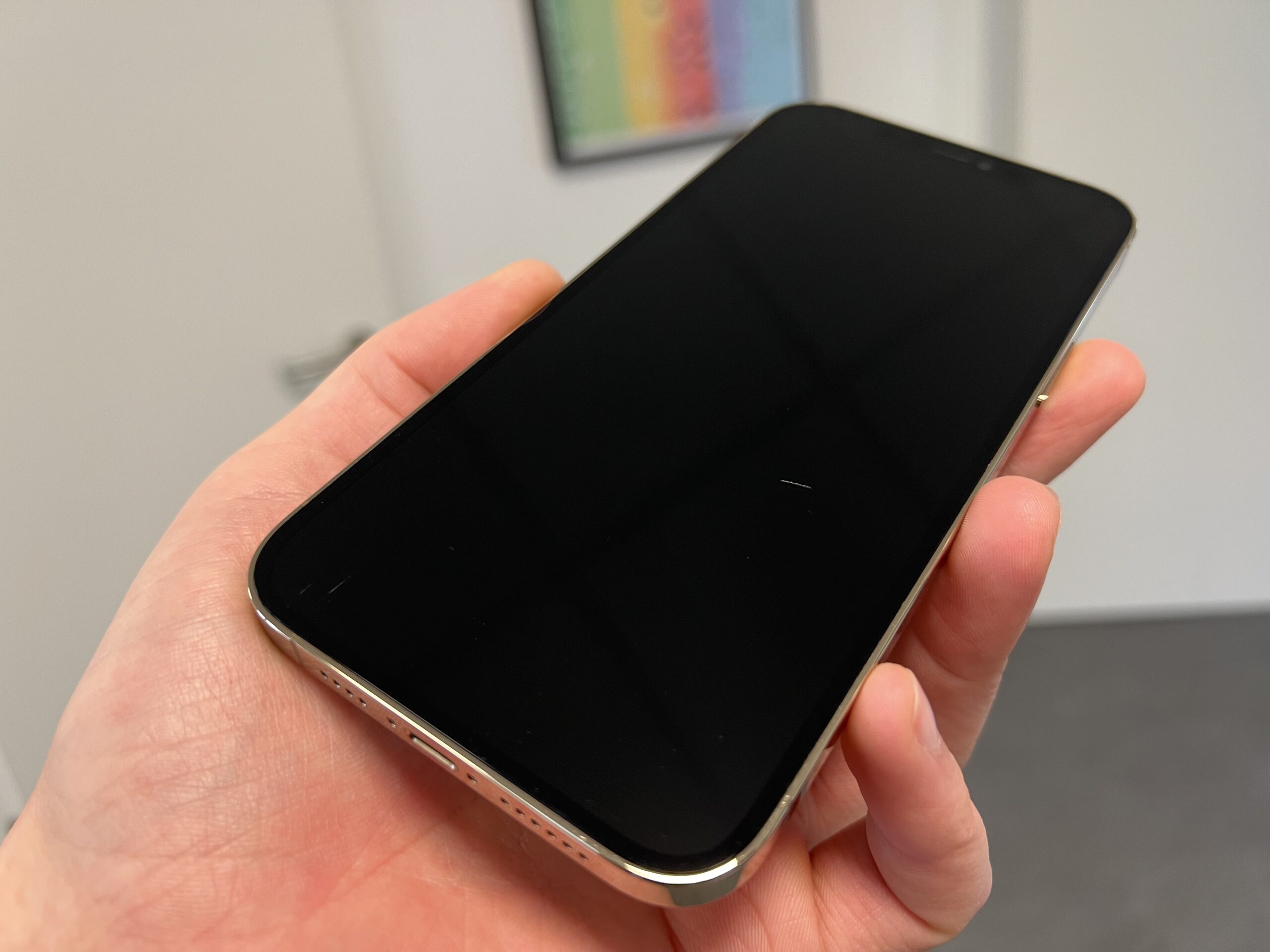 Zudem habe ich das iPhone 12 Pro Max einmal fallen gelassen – kurz bevor das iPhone 13 raus kam. Es ist mir aus Tischhöhe aus der Hand geglitten und ich habe es noch mit dem Fuß leicht abgefedert. Das Display ist nicht gesplittert, dafür habe ich mir einen echt unschönen Kratzer in der Notch eingefangen. Dieser ist genau zwischen Kamera und Hörer, demnach ist das iPhone weiterhin ohne Einschränkungen nutzbar. Schön ist das aber nicht.