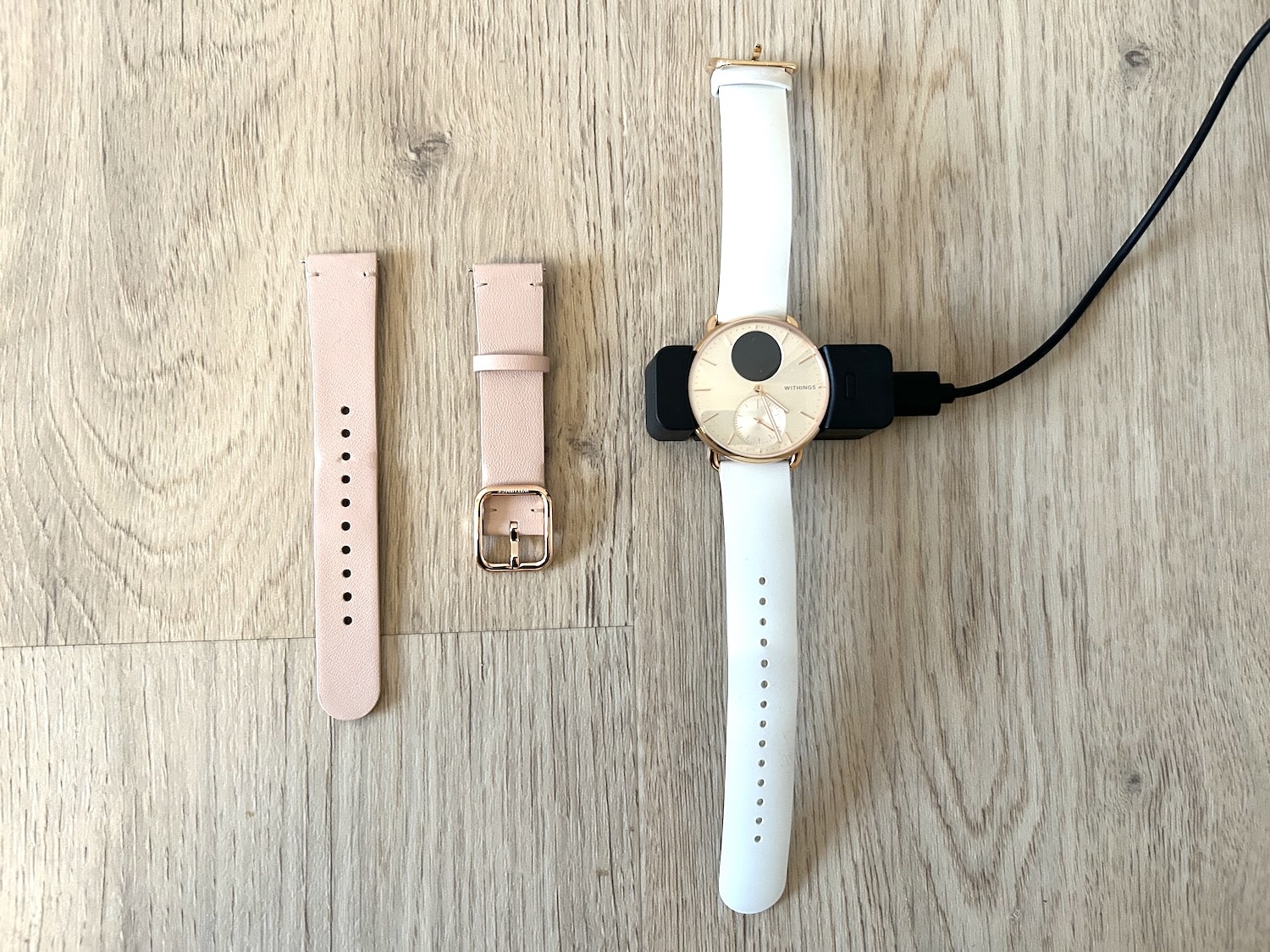 Wer bei Withings im Store bestellt, kann beim Bestellvorgang außerdem weitere Armbänder direkt mitbestellen. Ich habe mich im Zuge dessen für ein zusätzliches pfirsichfarbenes Lederarmband entschieden.