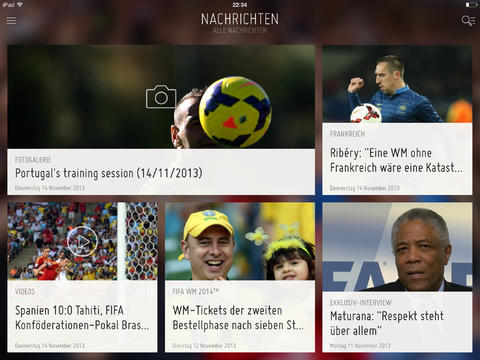 Der Vollständigkeit halber müssen wir natürlich auch die FIFA-App nennen, wobei diese App in Sachen Informationsfülle und Aktualität nicht mit den speziell für das Fußball-Event erstellten WM-Apps mithalten kann. Insbesondere auf dem iPad macht die App aber einen modernen Eindruck und lädt zum Stöbern durch Artikel, Bilder und Videos ein.