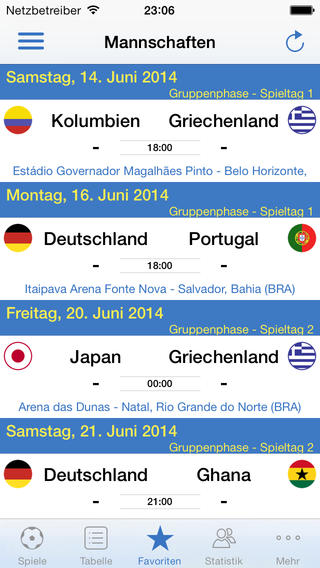 Die werbefreie Applikation für iPhone und iPad verzichtet auf ausführliche News und konzentriert sich voll und ganz auf Daten und Fakten. Nach dem Start der App sieht man sofort aktuelle Ergebnisse und kommt über den Favoriten-Reiter noch schneller an seine Lieblingsmannschaft, voreingestellt ist Deutschland. Mit WM 2014 Pro hat der Entwickler eine quasi baugleiche App im Portfolio, die den DFB-Adler als Icon trägt. Besonders praktisch: Spieltermine können direkt in den eigenen Kalender übertragen werden.