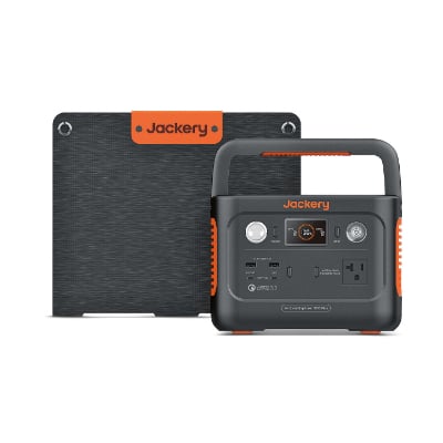 Genauer gesagt geht es um den Jackery Solargenerator 300 Plus mit 40W Solarmodul. Es handelt sich um eine kleine Powerstation mit LifePO4-Akkus und einer Kapazität von 288 Wattstunden. Auf der Vorderseite könnt ihr eure Geräte anschließen, hier findet ihr eine herkömmliche 230V Steckdose, zwei USB-C Ports mit 100 Watt sowie eine USB-A Buchse mit 15 Watt. Ein SOS-Licht und ein Autoanschluss sind ebenfalls vorhanden.