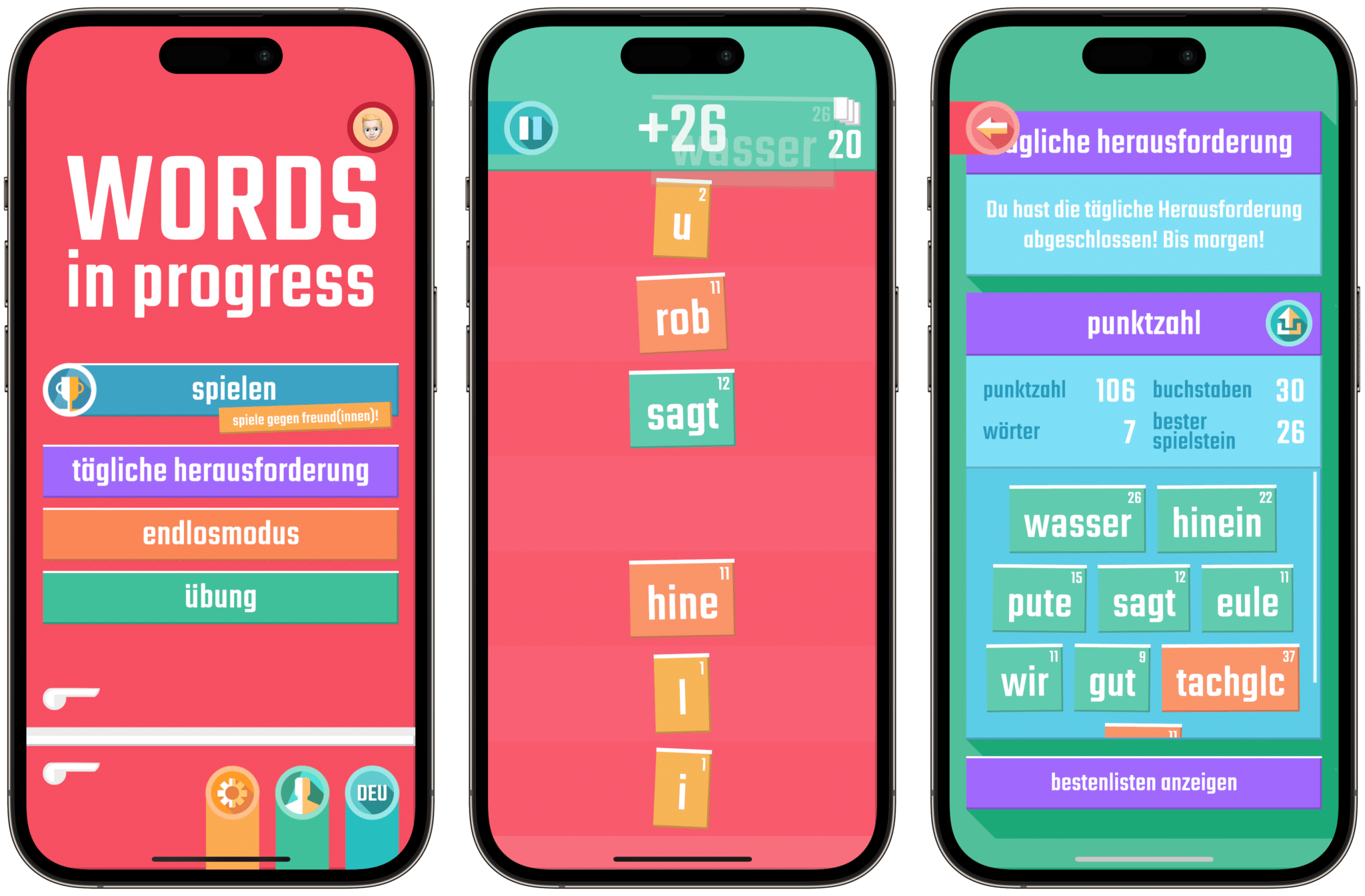 Fertige Wörter können dann einfach nach oben in den Punktebereich geschoben werden, um Platz für neue Buchstaben zu schaffen. Oder man riskiert ein wenig und versucht, zwei Wörter miteinander zu kombinieren – aus Auto und Reifen kann man das besonders wertvolle Wort Autoreifen.