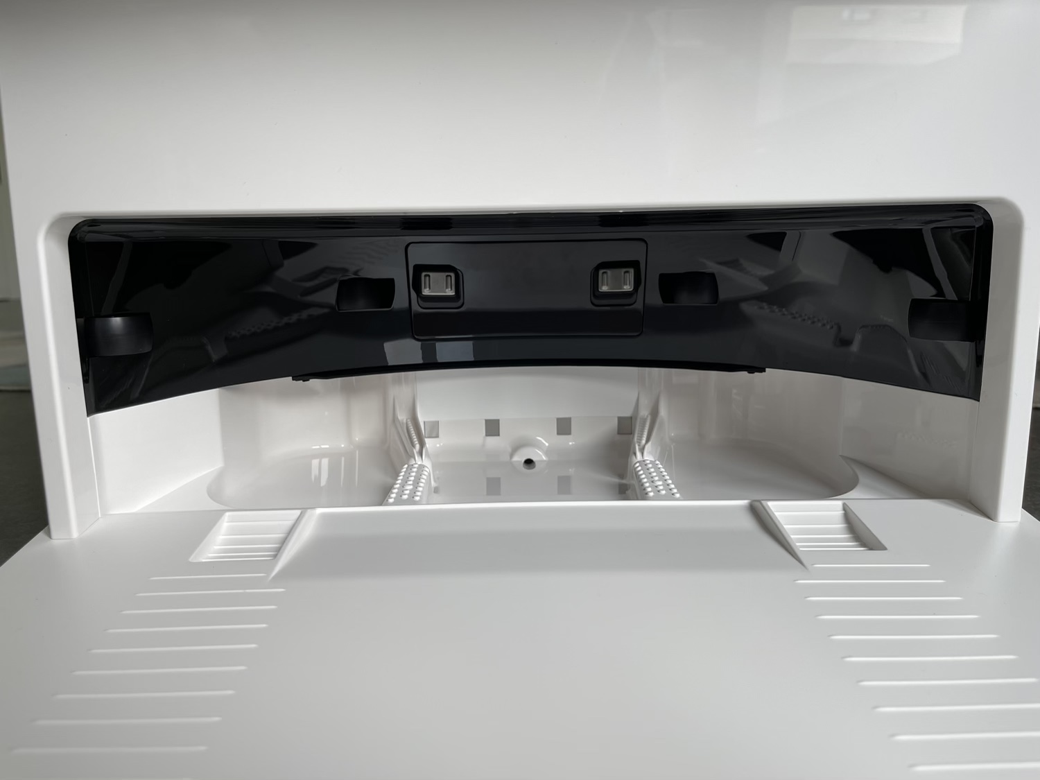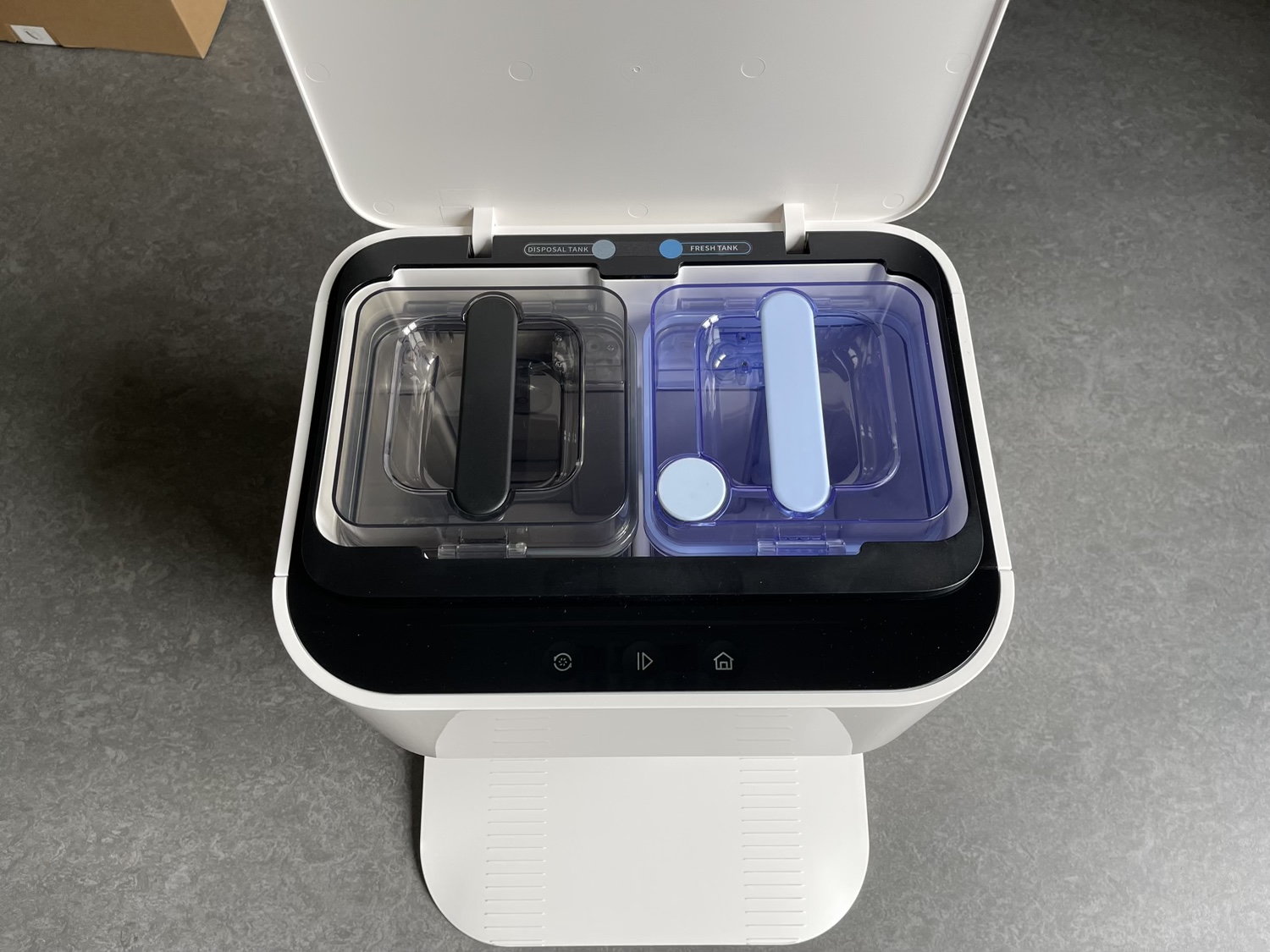 Die Selbstreinigungsstation ist optisch sicherlich kein Hingucker, fällt in ihrer weißen Variante vor einer weißen Wand aber gar nicht mal so auf. Mit Abmessungen von 411 x 382 x 430 Millimeter nimmt die Station schon viel Platz ein und fordert umstehend freien Raum. Durch die großen Abmessungen ist aber auch viel Platz in der Station: Hier gibt es nämlich zwei Wassertanks mit jeweils 3500 Milliliter, die zur Reinigung der Wischpads dienen.