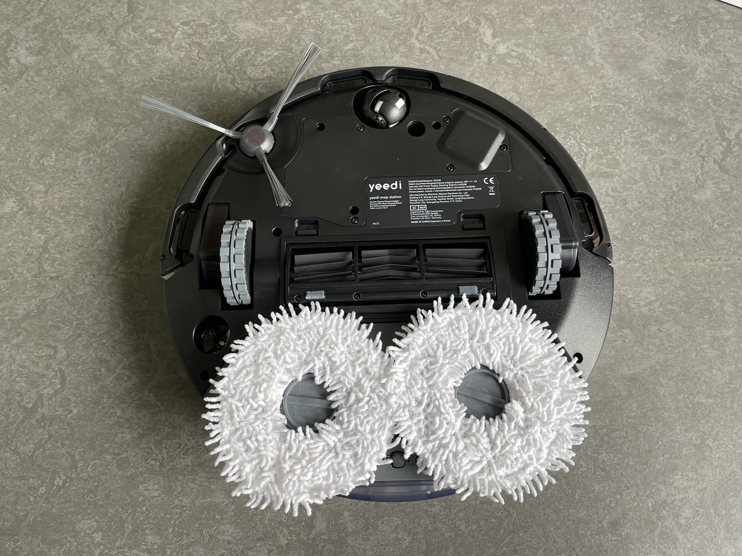 Die Yeedi Mop Station ist das Highlight und der Fokus liegt ganz klar auf der Wischfunktion. Während andere Roboter einfach nur ein halbfeutches Wischtusch hinter sich her ziehen und oftmals nur sehr kleine Bahnen befeuchten und reinigen, gibt es beim Yeedi Roboter zwei rotierende Wischpads. Diese drehen sich entgegengesetzt und 180 Mal in der Minute. Der Anpressdruck wird mit 10 Newton angegeben, was ein solider Wert ist und auch etwas hartnäckigere Flecken löst, aber auch hier wird das händische Wischen nicht komplett ersetzt.