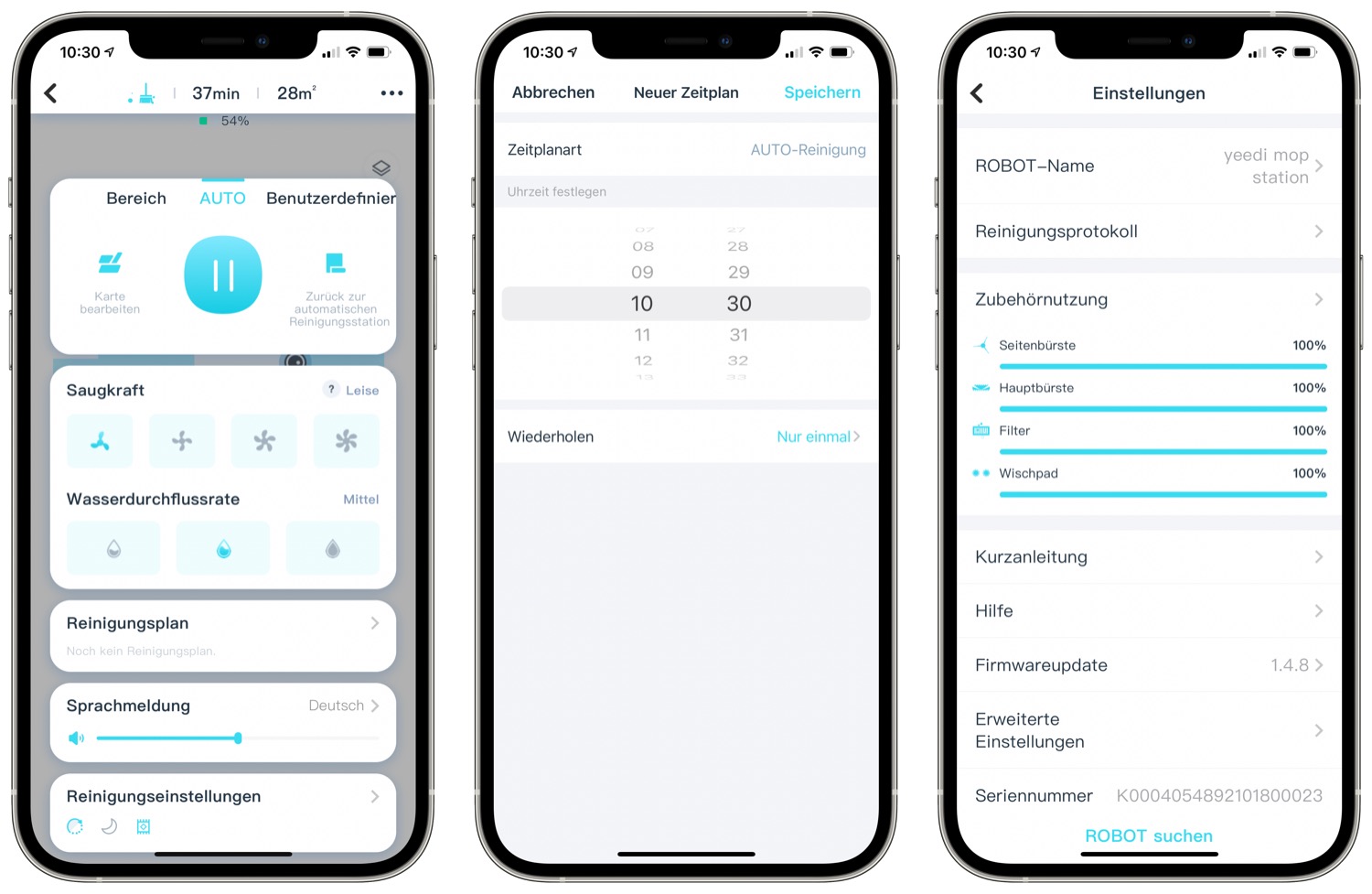 In der App könnt ihr eure Karte einsehen und bearbeiten. Zudem könnt ihr die Saugkraft und die Wasserdurchflussrate justieren. Zeitpläne erleichtern die automatische Reinigung. In der Statistik könnt ihr alle Fahrten einsehen, ebenso wird angezeigt, wann man seine Bürsten, Filter oder Wischpads säubern sollte.
