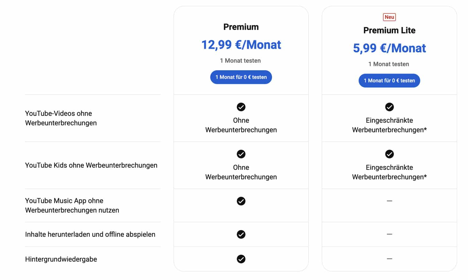 Mit YouTube Premium Lite, ein abgespeckter Tarif, der schon seit Oktober 2023 getestet wird, kann man sich nur von der Werbung befreien. Und das auch deutlich günstiger, denn der Lite-Tarif kostet nur 5,99 Euro, während die „Vollversion“ 12,99 Euro pro Monat kostet.