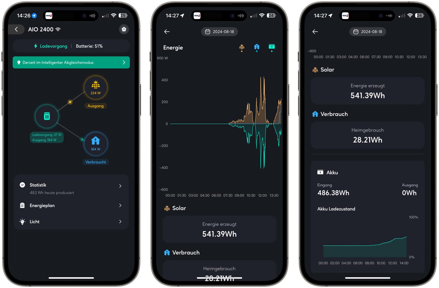 Sind die Solarmodule einmal installiert, alle Kabel verdrahtet und der Zendure AIO 2400 angeschlossen, müsst ihr nur noch auf viel Sonne hoffen. In der zugehörigen Zendure-App könnt ihr das Balkonkraftwerk mit eurem WLAN und Bluetooth verbinden und alle Einstellungen bequem am Smartphone tätigen. Auf der Startseite könnt ihr sofort sehen, wie viel Strom gerade produziert, wie viel gespeichert und wie viel Strom aktuell eingespeist wird.