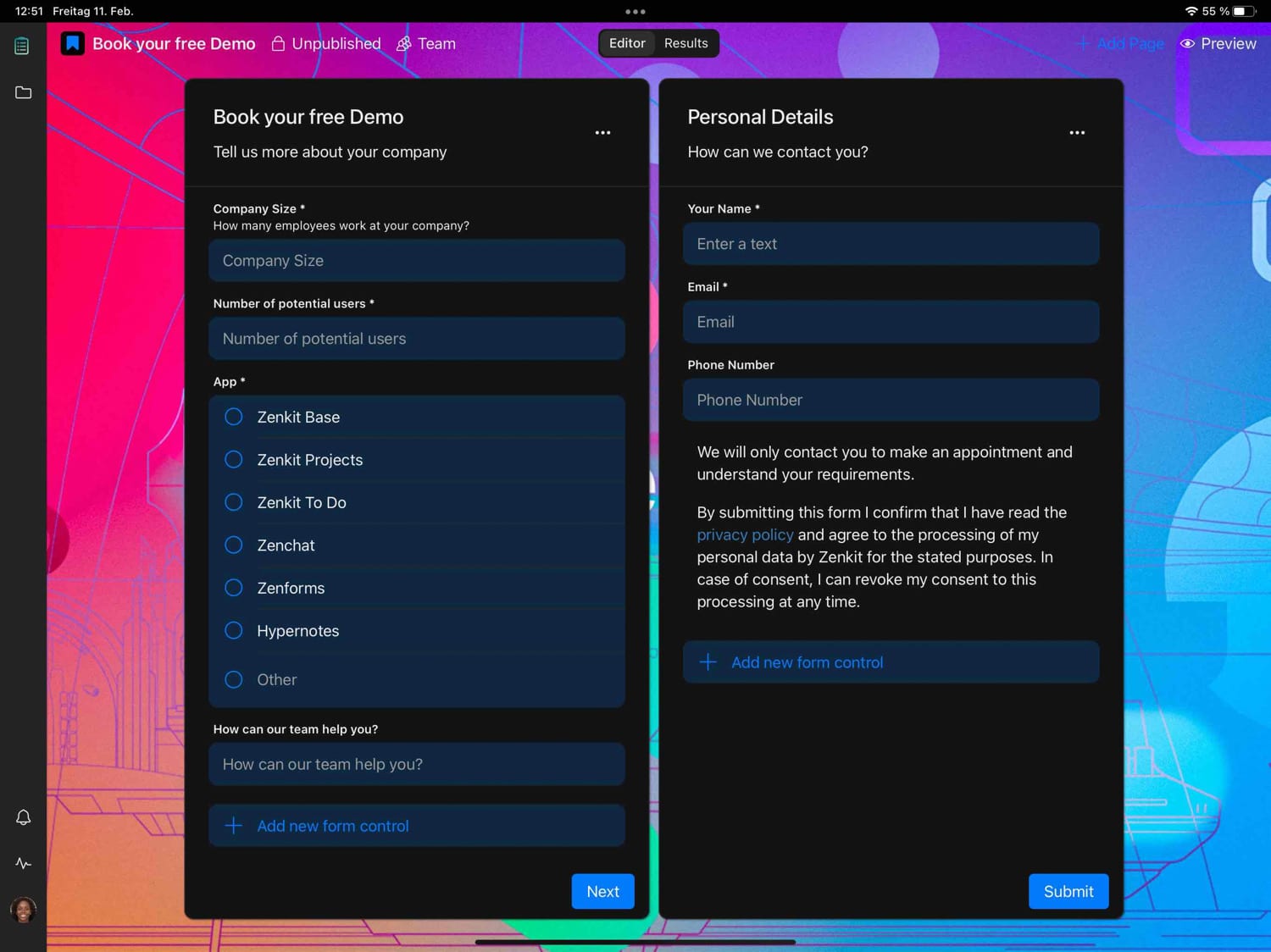 Am 3. März dieses Jahres will das ZenKit-Entwicklerteam nun mit ZenForms eine neue und die mittlerweile sechste App der stetig wachsendem Zenkit-Produktivitäts-Suite veröffentlichen. ZenForms fungiert dabei als datenschutzkonforme, Do-it-yourself-Webformular-App, mit der man eigene Formulare mit Klicks statt aufwändigem Code erstellen kann.